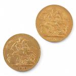 Deux PIECES en or, Souverain Georges V, 1912 et 1913 Lot conservé en banque, vendu sur désignation, délivrance sur rendez-vous