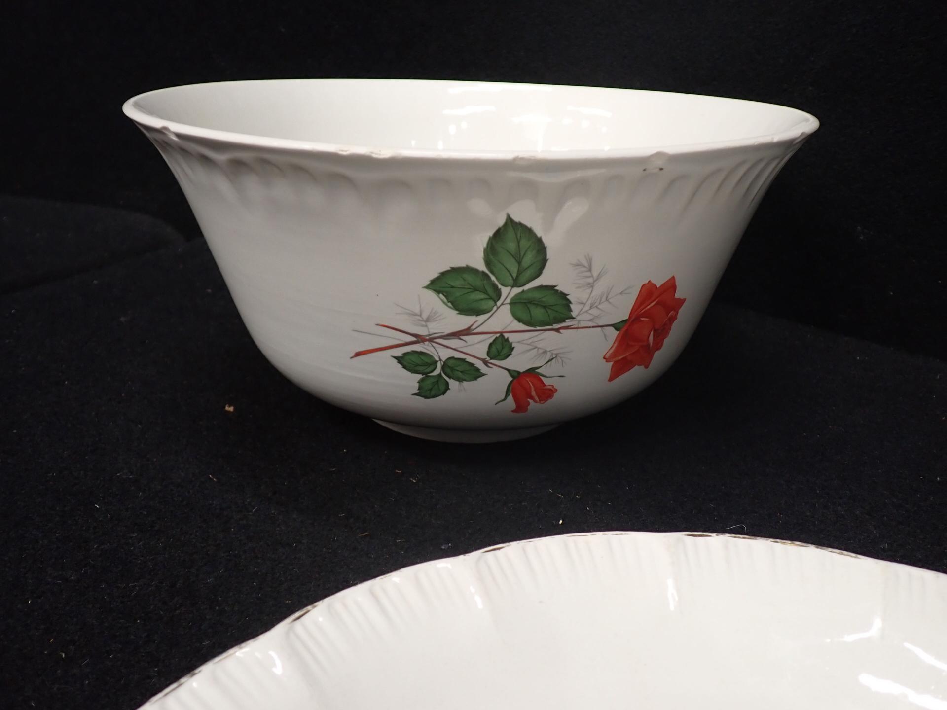 DIGOIN SARREGUEMINES - Partie de service de table en faïence émaillée polychrome à décor de roses marquée au revers : 1 saucière, 1 plat ovale, 2 raviers, 1 saladier, 1 plat rond (usures)