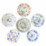CHINE Six assiettes ou plats ronds en porcelaine à décor bleu blanc ou Imari D.: 20.5 à 25.5 cm (accidents et restaurations)