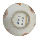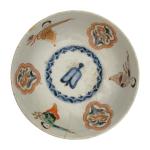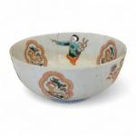 CHINE Bol rond en porcelaine à décor polychrome et or de personnages et animaux dans des cartouches XIXème H.: 7 cm D.: 15.5 cm (fêles)