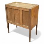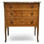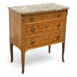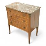 COMMODE en bois naturel, bois de placage et marqueterie, ouvrant à trois tiroirs, dessus de marbre Style Transition Louis XV - Louis XV H.: 80 cm l.: 73 cm P.: 39 cm