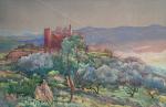ECOLE début XXème Le château dominant la vallée Aquarelle signée en bas à gauche 34 x 53 cm à vue (piqûres)