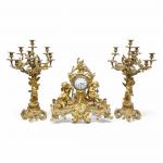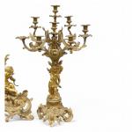GARNITURE DE CHEMINEE en bronze doré à décor rocaille de putti, angelots, feuillage, fleurs, comprenant une pendule et une paire de candélabres à huit bras de lumière, le cadran émaillé