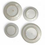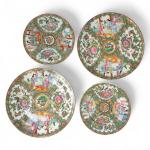 CHINE Canton Quatre assiettes rondes en porcelaine à décor polychrome et or D.: 18.3 et 24 cm (restaurations aux deux grandes)