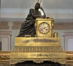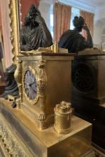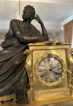 PENDULE en bronze doré et patiné représentant un écrivain ou philosophe antique couronné de lauriers appuyé sur une borne dans laquelle s'inscrit le cadran et dont les montants sont flanqués de tête de griffons
