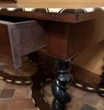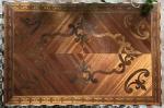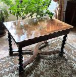 TABLE BUREAU en bois de placage et marqueterie de bois précieux, bois noirci et os, ouvrant à un tiroir en ceinture, le piètement réuni par une entretoise, le plateau à décor de fleurs de lys