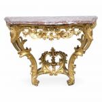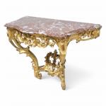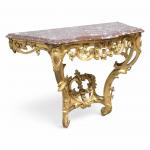 CONSOLE en bois sculpté, mouluré et doré à décor de feuillage, fleurs, couronnes et écusson, dessus de marbre Epoque Louis XV H.: 83 cm l.: 115 cm P.: 53 cm