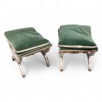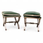 Paire de TABOURETS en bois sculpté, mouluré, peint et doré, le piètement en X Début XIXème H.: 46 cm l.: 55 cm P.: 46 cm