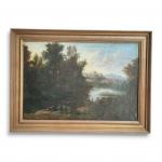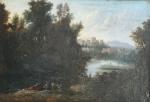 ECOLE FRANCAISE du XIXème Personnages au bord de l'eau dans un paysage arboré Huile sur toile 41 x 60 cm (restaurations anciennes)
