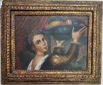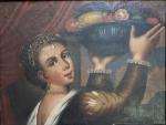 ECOLE FRANCAISE vers 1900 Jeune servante apportant une coupe de fruits Huile sur toile marouflée sur panneau 38 x 50 cm (déchirures, petits manques)