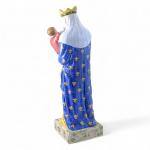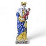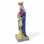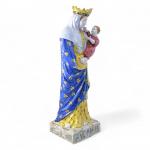 VIERGE A L'ENFANT en faïence à décor émaillé polychrome, annotée "Ave Maria" sur la base H.: 71 cm (légers sauts d'émail)