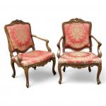 Paire de FAUTEUILS à dossier plat en bois naturel richement sculpté XVIIIème, travail du Sud Est