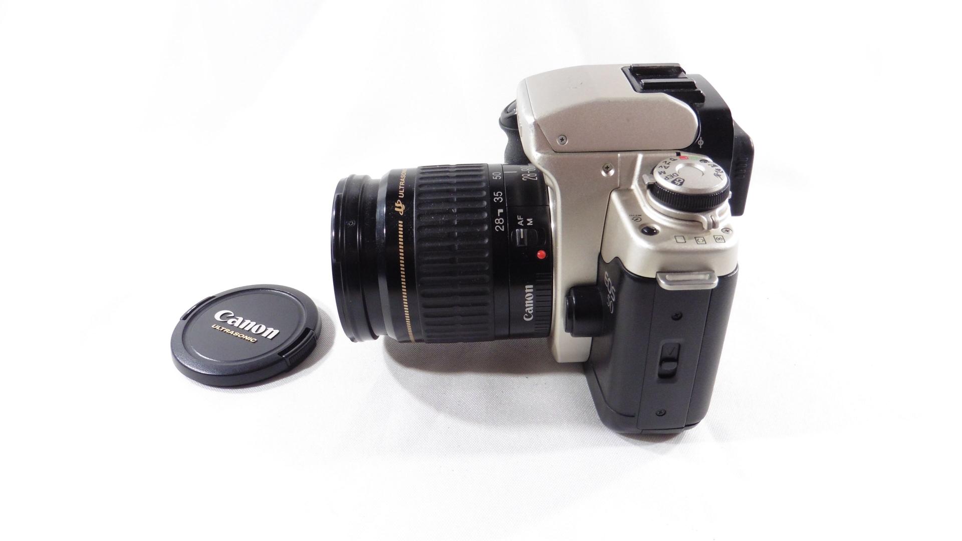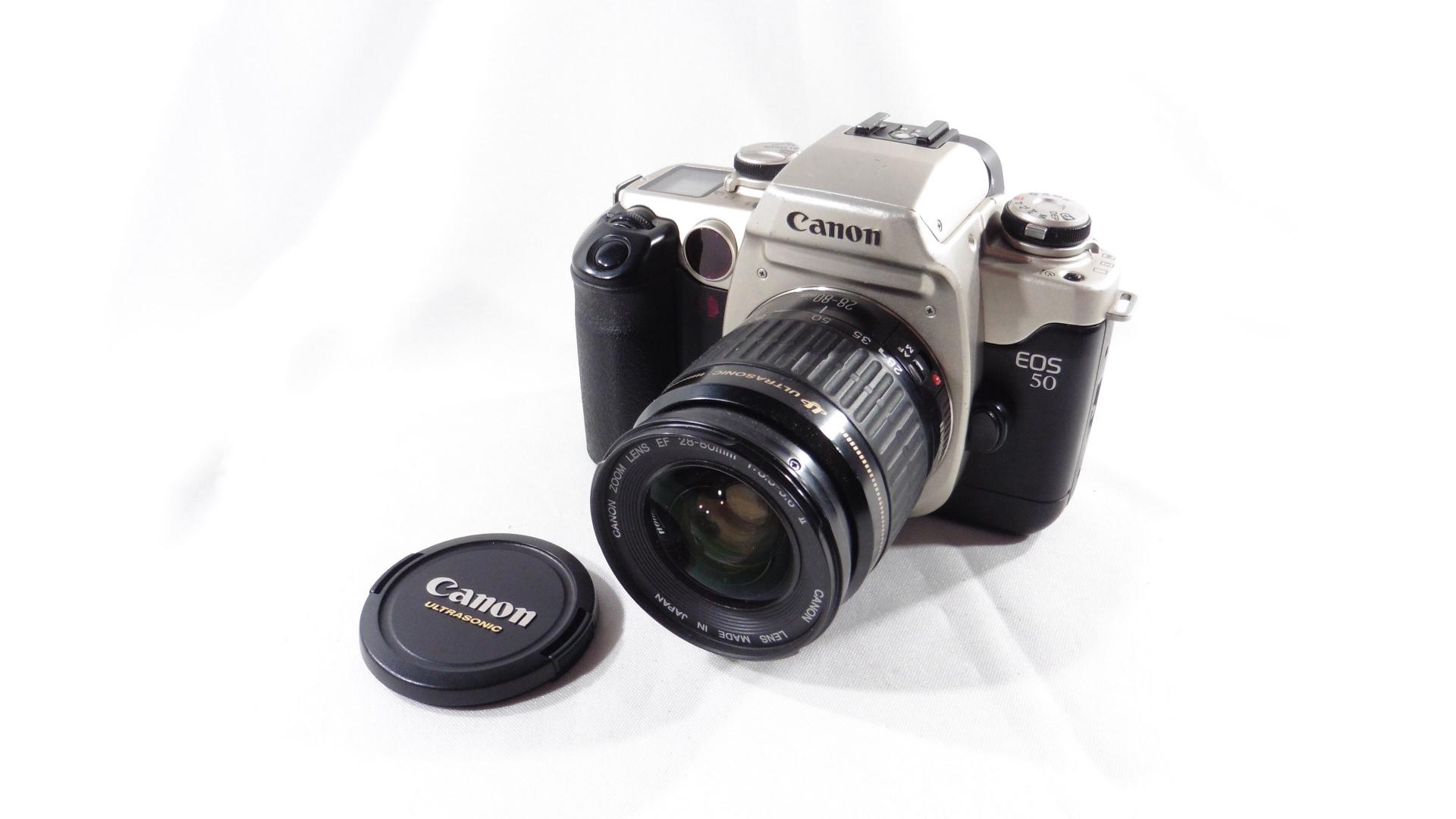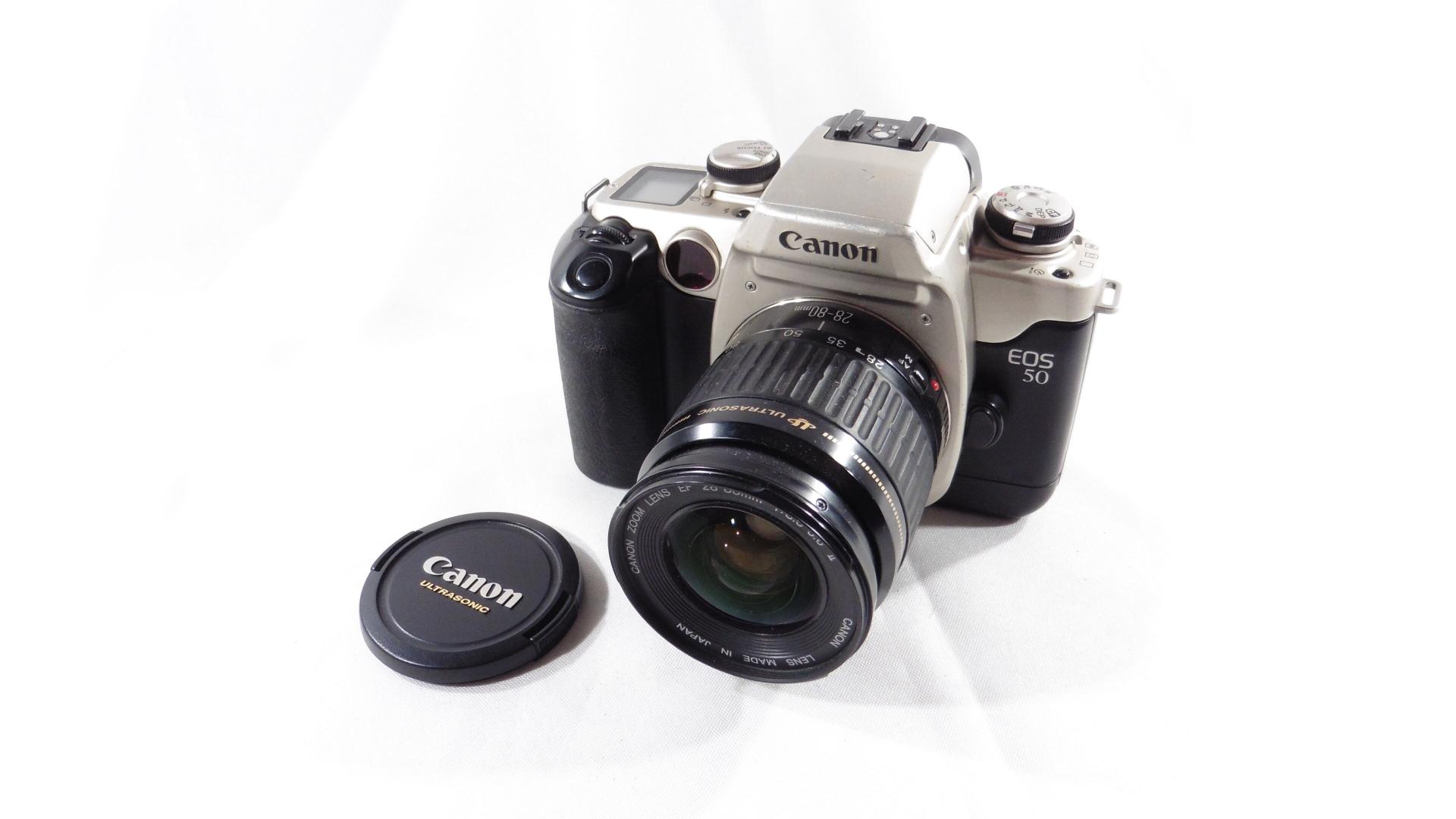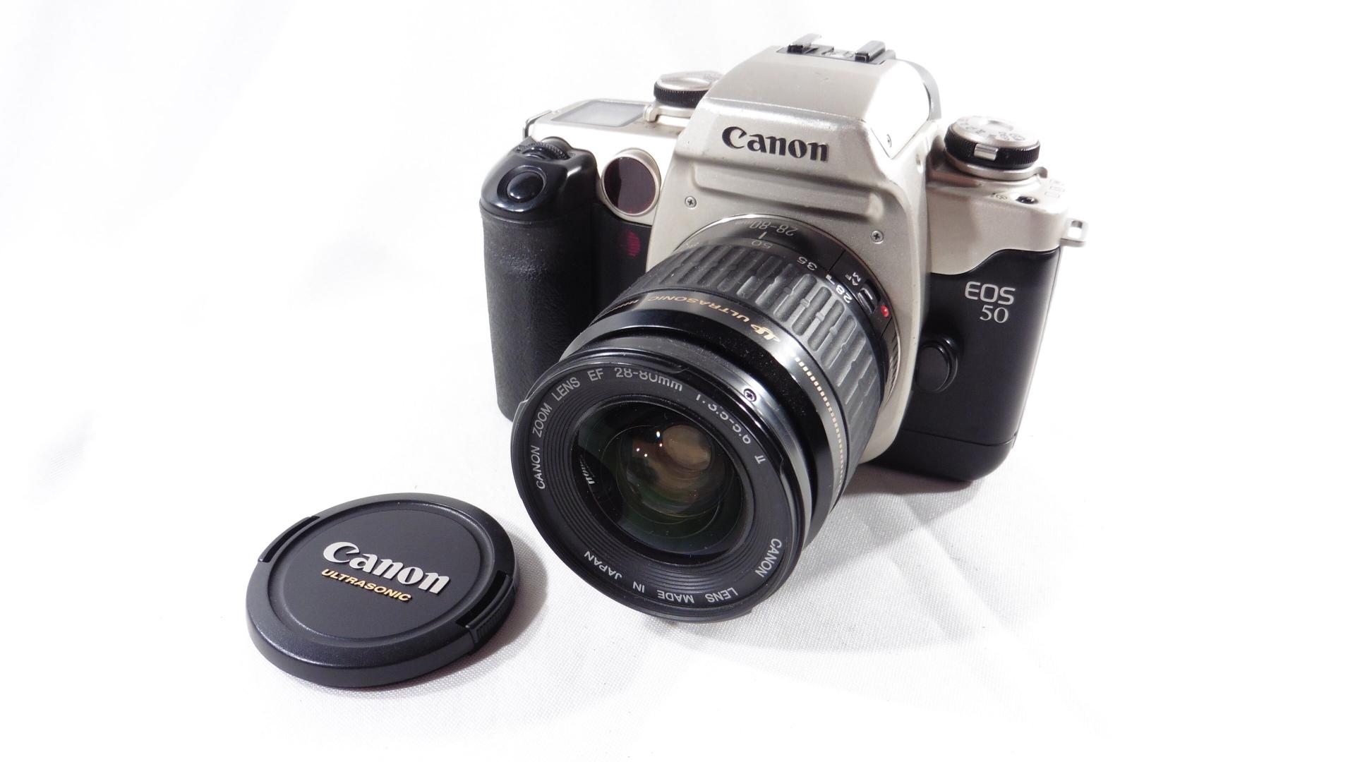 Canon EOS 50 avec pile fonctionnel + Objectif Canon USM EF 28-80mm 3.5-5.6 II. Appareil photo argentique 24x36 auto-focus.