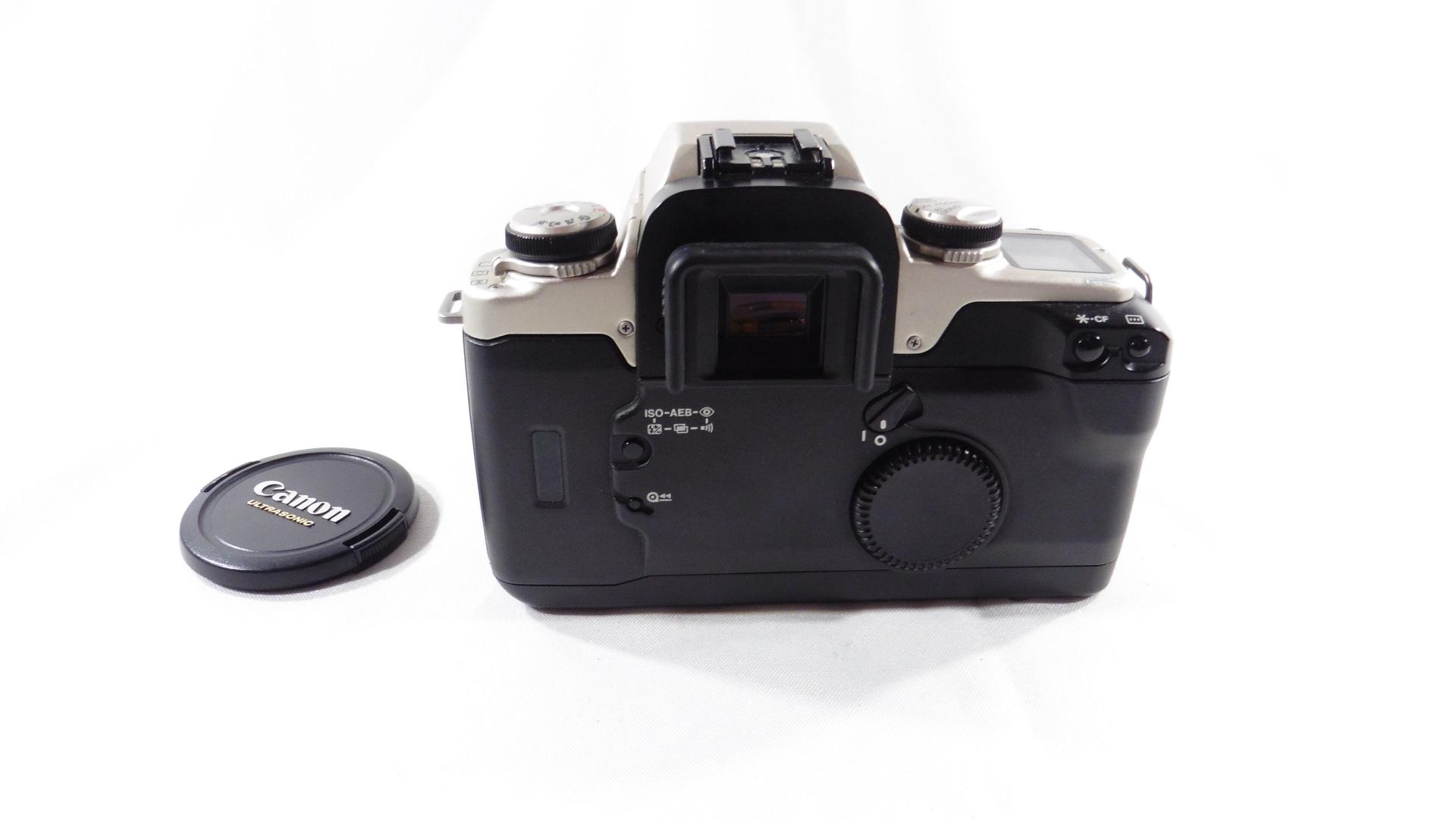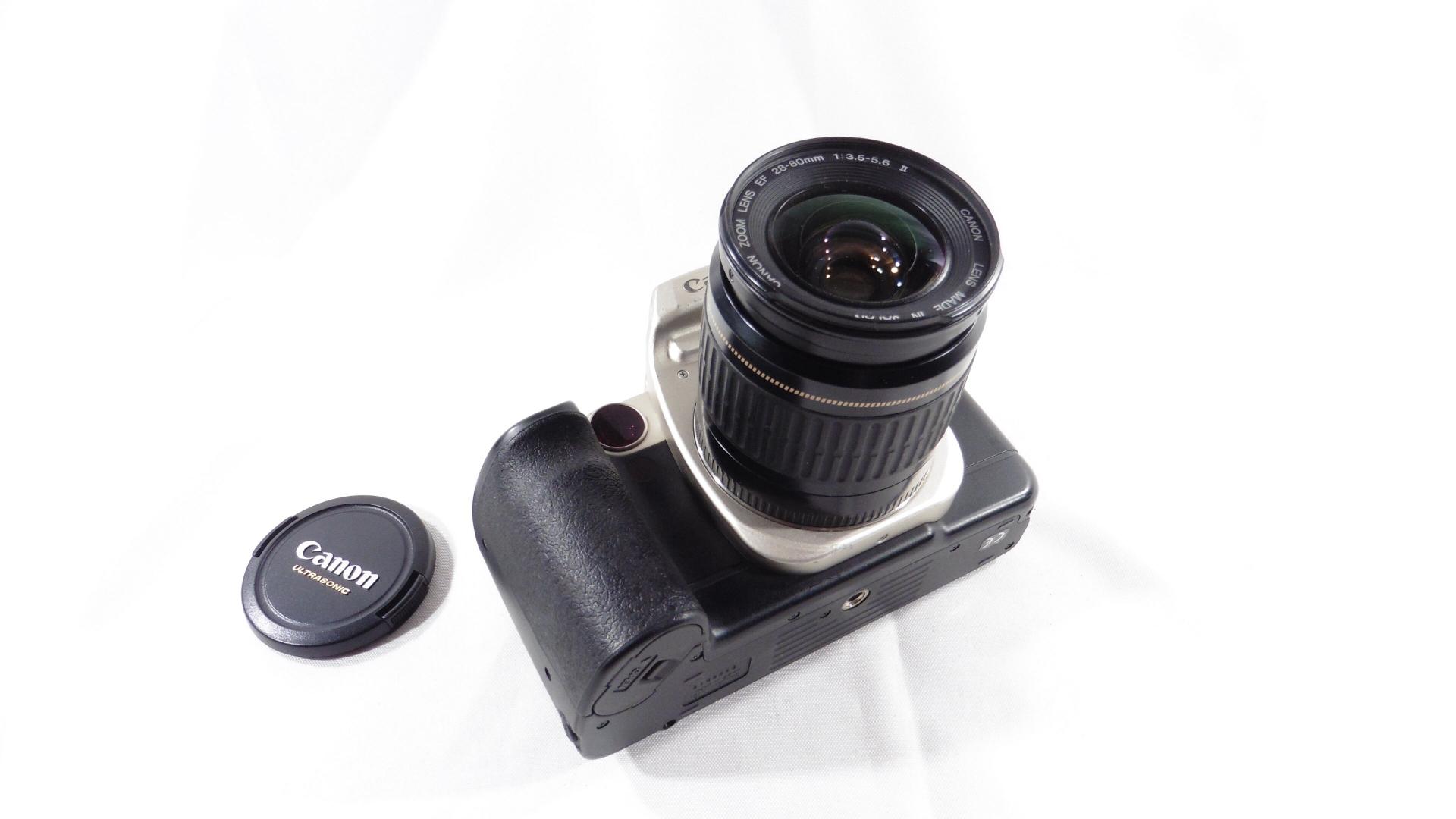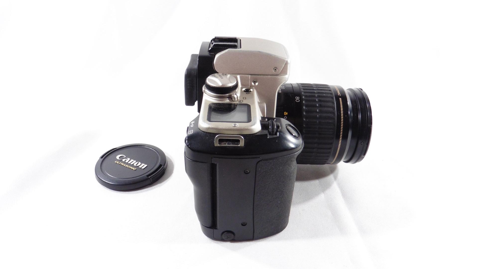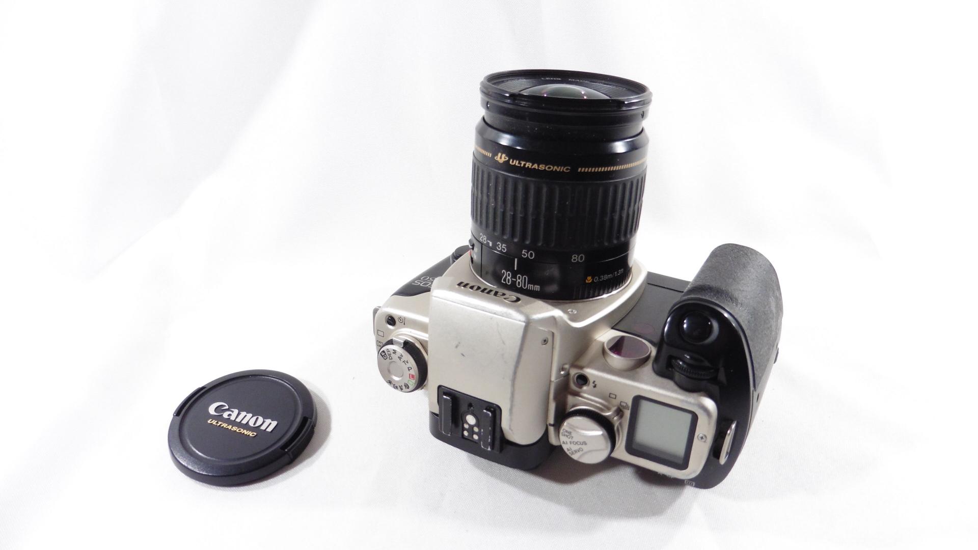 Canon EOS 50 avec pile fonctionnel + Objectif Canon USM EF 28-80mm 3.5-5.6 II. Appareil photo argentique 24x36 auto-focus.