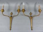 8 - Paire d'appliques à deux branches de style Louis XVI en bronze, surmontées d'une urne. Haut. sans les fausses bougies : 38 cm