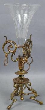 18 - Vase cornet en verre gravé, monture tripode en bronze à pieds jarrets, époque fin XIX' s. Haut. : 39 cm