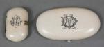 41 - Etui à couture en ivoire chiffré MD avec accessoires dont étui à aiguilles en vermeil (manques et éléments remplacés) Long. : 11 cm, et petit porte-monnaie en ivoire chiffré. Long. : 6 cm, ép. Napoléon III
