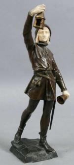 53 - MARIOTON Eugène (1854-1933) : ''Le couvre-feu''. Bronze patiné et ivoire sculpté, signé. Haut : 34,5 cm