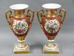 71 - PARIS : Paire de grands vases balustres d'époque Empire en porcelaine à décor de fleurs en réserve sur fond bordeaux réhaussé d'or, anses feuillagées à palmettes terminées par une tête de bélier. Haut. : 43 cm (usures à la dorure et restauration)