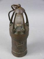 90 - Lampe de mineur en fer et bronze, forme ogive, numérotée C 13 et 208. Haut. sans le crochet : 27 cm