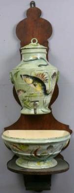104 - MONTIGNY S/LOING - Georges DELVAUX (1834-1909) - Charles-VIRION (1865-1946) : Fontaine couverte et son bassin en faïence à décor peint de poissons dans le milieu aquatique, signés Montigny s/ Loing et Dx, la fontaine signée Virion. Bassin : Haut. : 16 cm - Larg. : 36 cm. Fontaine couverte : Haut. totale 38 cm (fêlure au bassin, manque et réparation à la fontaine)
