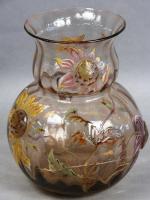 109 - GALLE Emile : Vase boule à col étranglé en verre fumé transparent poudre d'or et à décor floral avec cabochons en application, signé ''Cristallerie d'Emile GALLE, modèle et décor déposés''. Haut. : 20 cm (important fêle circulaire sur le corps)