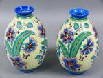 113 - KERAMIS : Paire de vases ovoïdes en faïence à décor en émaux polychromes de fleurs stylisées, marqués. Haut. : 30 cm