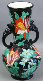 114 - LONGWY : Vase ''Tropic'' en émaux polychromes à décor floral, anses à tête d'animal, marqué. Haut. : 33 cm