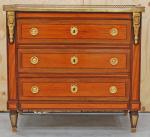 COMMODE en acajou et bois clair ouvrant à trois tiroirs, dessus marbre bleu turquin à galerie Epoque Louis XVI H. : 84 cm, L. : 90 cm, P. : 49 cm