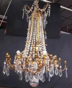Important LUSTRE à quinze bras de lumières, monture en bronze à volutes, plaquettes, poignards et rang de perles en cristal et verre, ép.XIX' Haut : 1,60 m Diam : 1,20 m