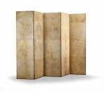 Paravent à cinq volets articulés entièrement gainé de parchemin Estampillé JM Frank et Chanaux & Cie, et numéroté deux fois 13736 et double frappe 3/5