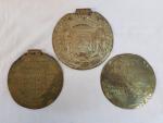 ... repoussé - la première portant l'inscription "Jaime-lelis-jaime-la-rose" entourée de têtes d'angelots ailés - la deuxième portant l'inscription "contentemant-passe-richesse-vive-la-mour-sans-tristes" - la dernière à décor d'armoiries aux chevrons tenues par deux personnages - époque XVIIeme et XVIIIeme - accidents, manques et restaurations