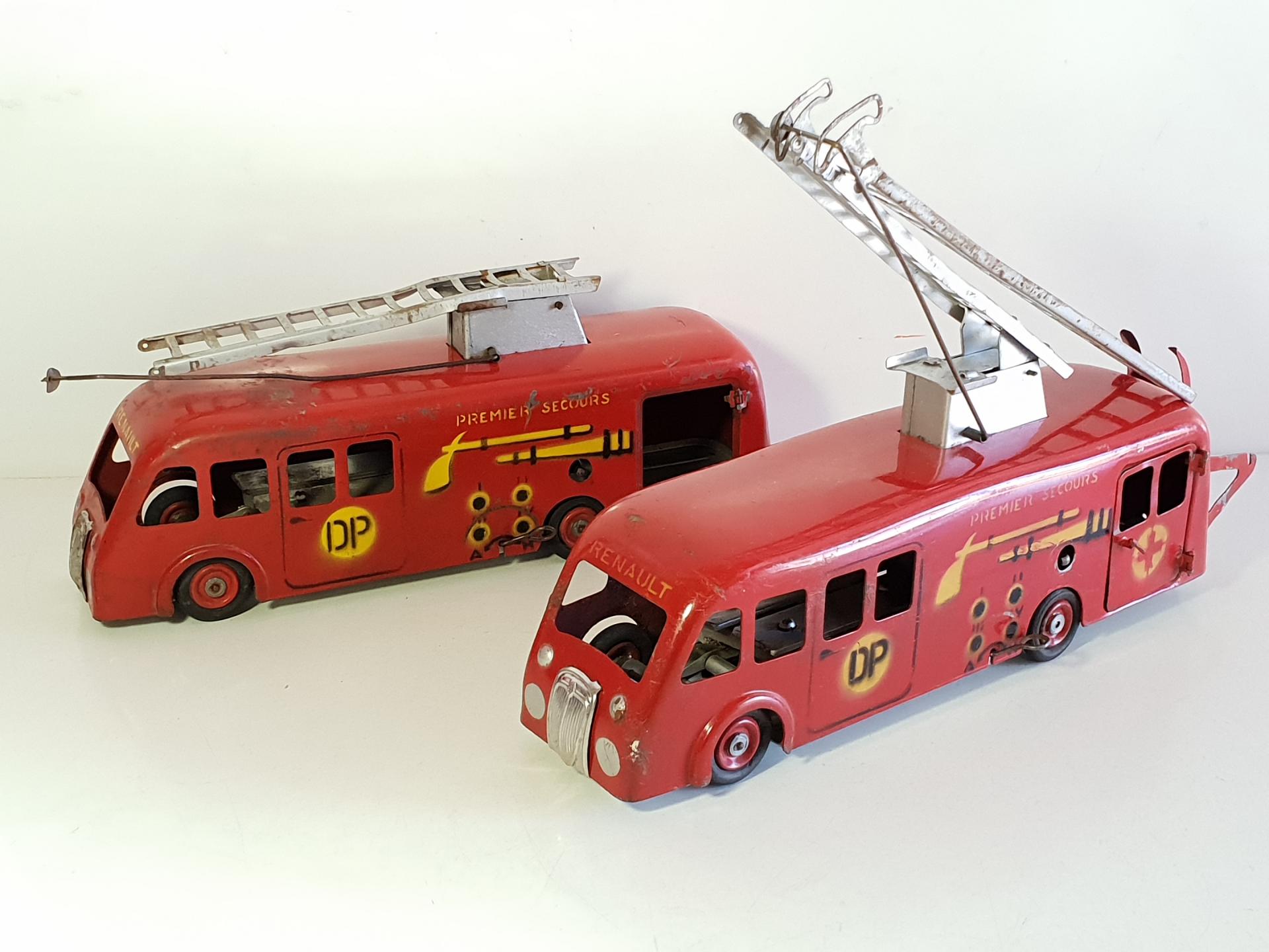 C.I.J. (Biare, v. 1939) 2 camions de pompiers Renault mécaniques : l’un fonctionne, l’échelle se lève (manque un petit axe reliant les deux échelles ensemble, manque le dévidor) L : 28 cm – l’autre est plus incomplet -