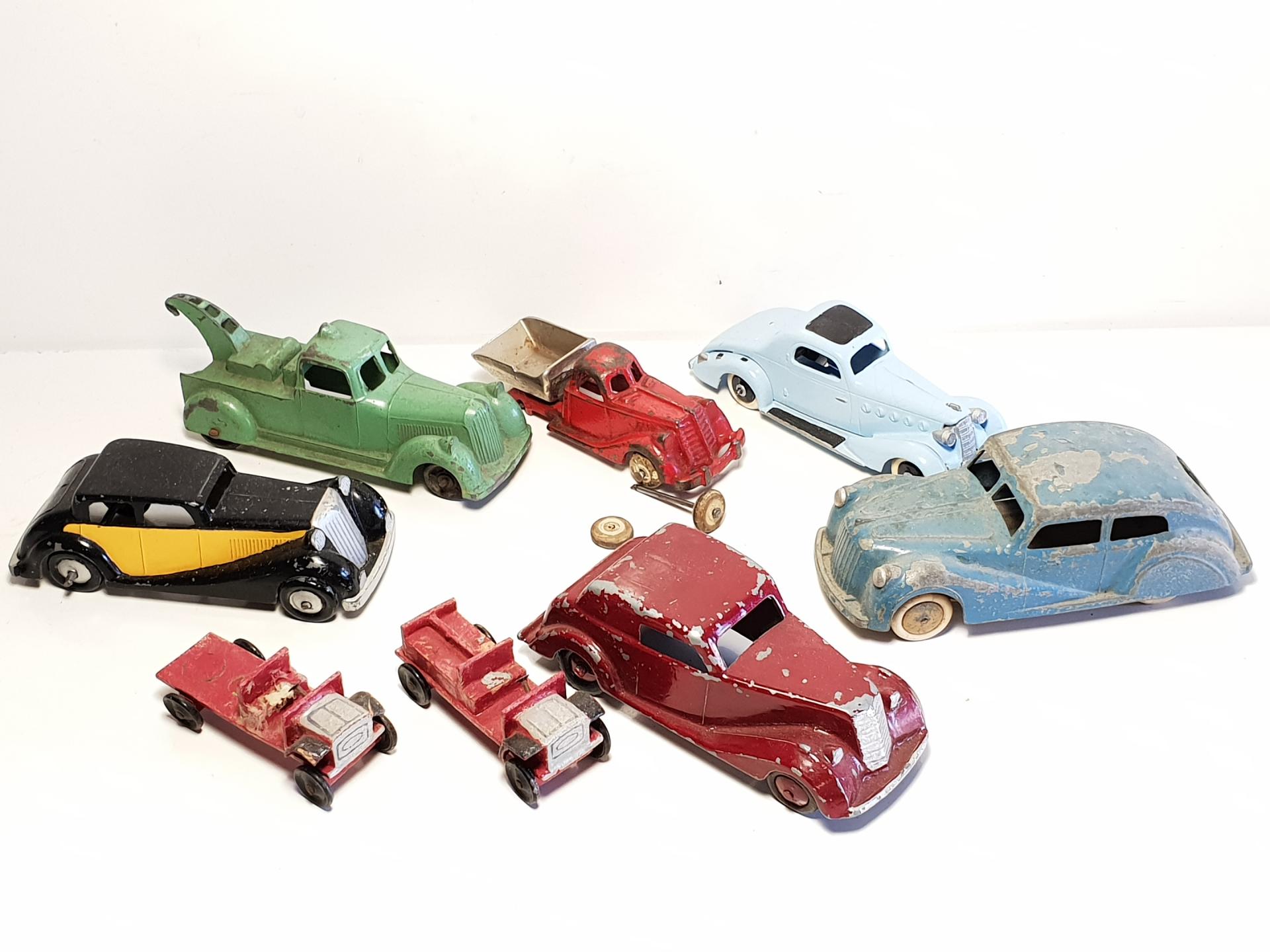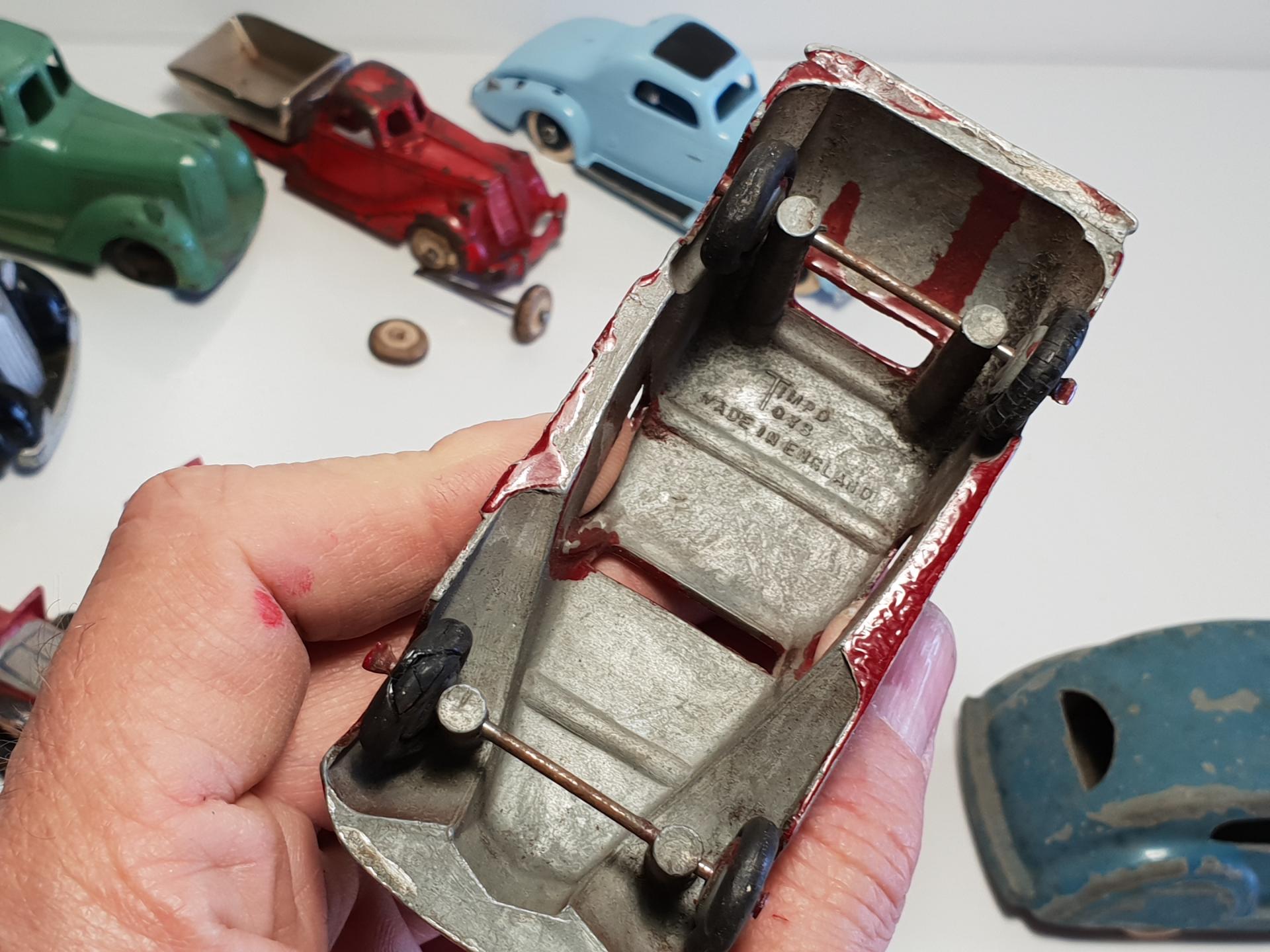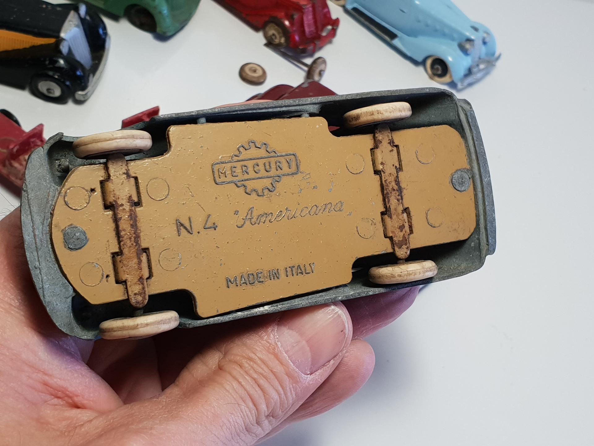 8 modèles anciens 1/43ème et assimilés :MERCURY n°4 Americana (écaillée mais le métal semble sain) D.oTIMPO Armstrong Siddeley DBUCCANEER La Salle coupé CHUBLEY – camion benne cast-iron D (L : 9cm, 2 roues à refixer) MARX Toby Toys dépanneuse DCRESCENT Jaguar saloon repeinte,2 ERZE GEBIRGE en bois incomplets