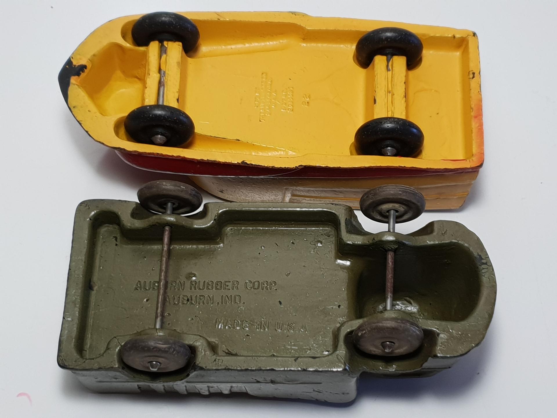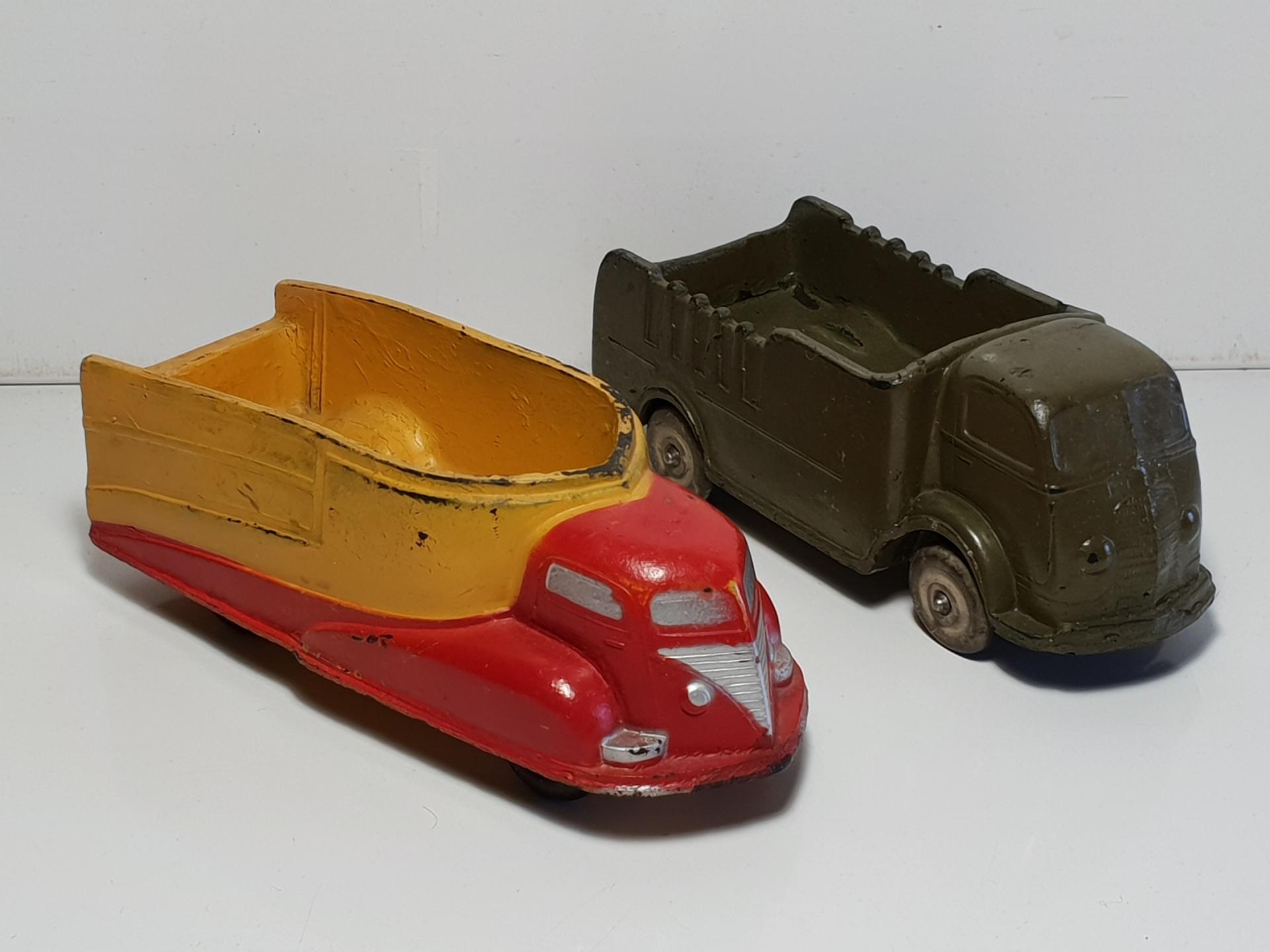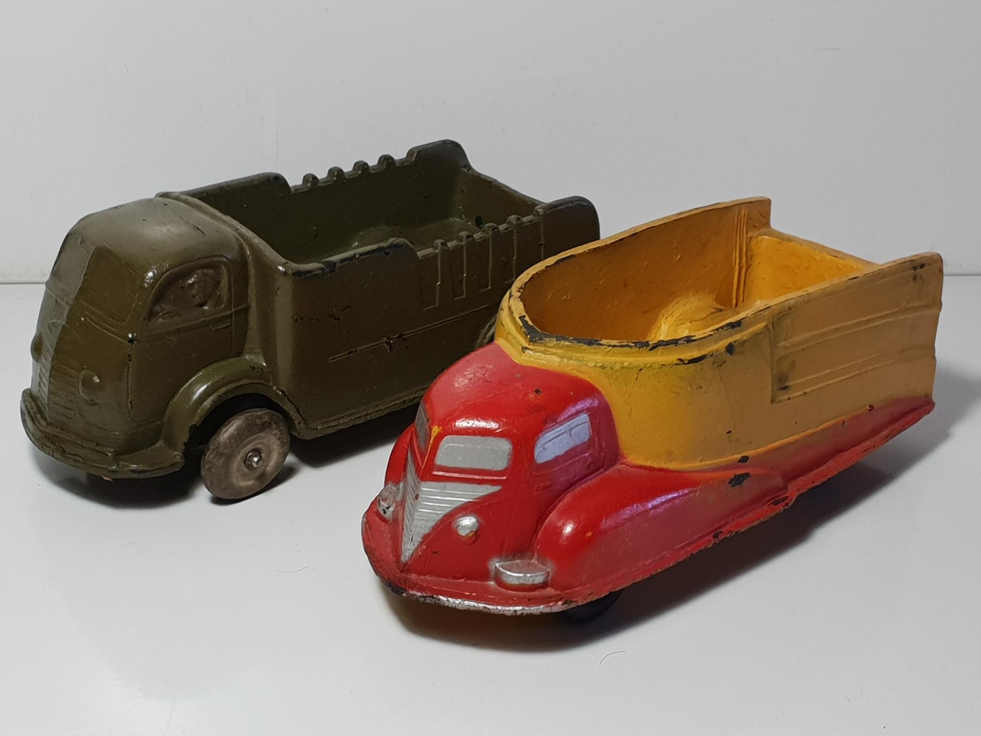 2 anciens camions maraîchers américains en caoutchouc dur laqué :SUN RUBBER (1938) Zéphyr rouge/jaune, L : 14,5 cm C+AUBURN RUBBER (1938) International Cabover vert olive L : 14cm C+