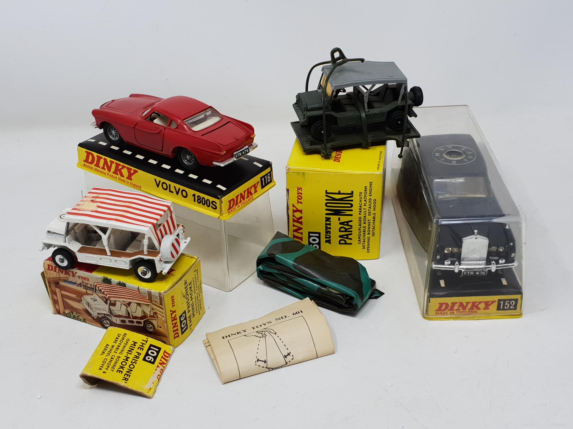 * DINKY G.B., 4 modèles :réf 106 Mini Moke The Prisoner blanc (gros accroc sur l'adhésif de capote, un rabat de boite détaché B.créf 601 Austin Para-Moke avec parachute et notice, A.c+ - version à speedwheels en boite carton, grapin souple cassé,réf 116 Volvo P1800s coupé rouge vif A.b,réf 152 Rolls Royce Phantom V bleu nuit A.b