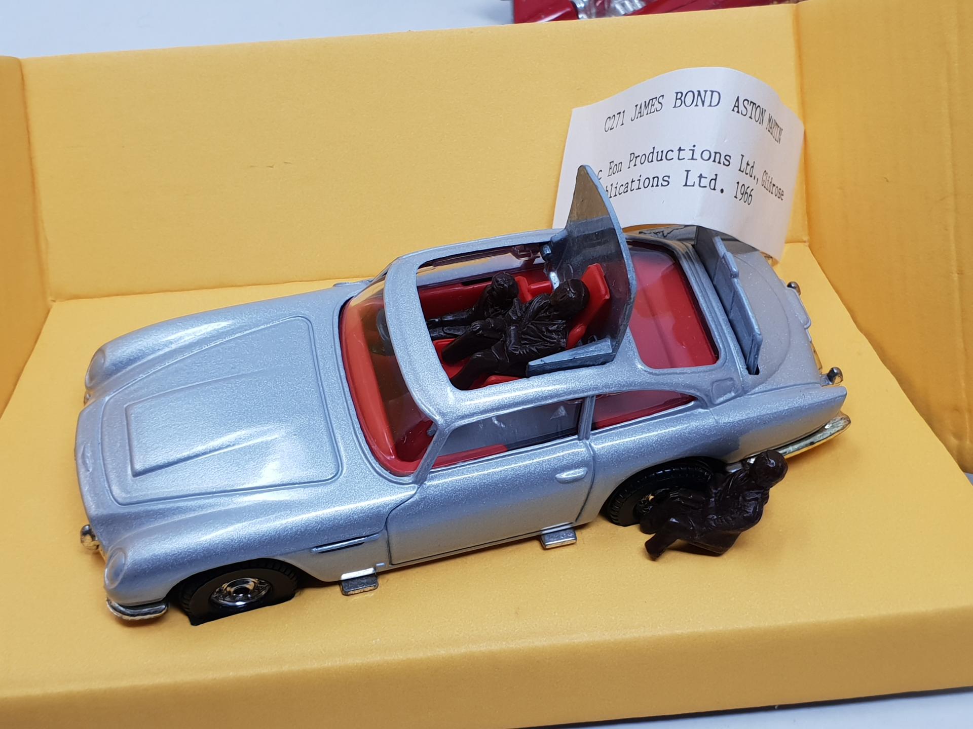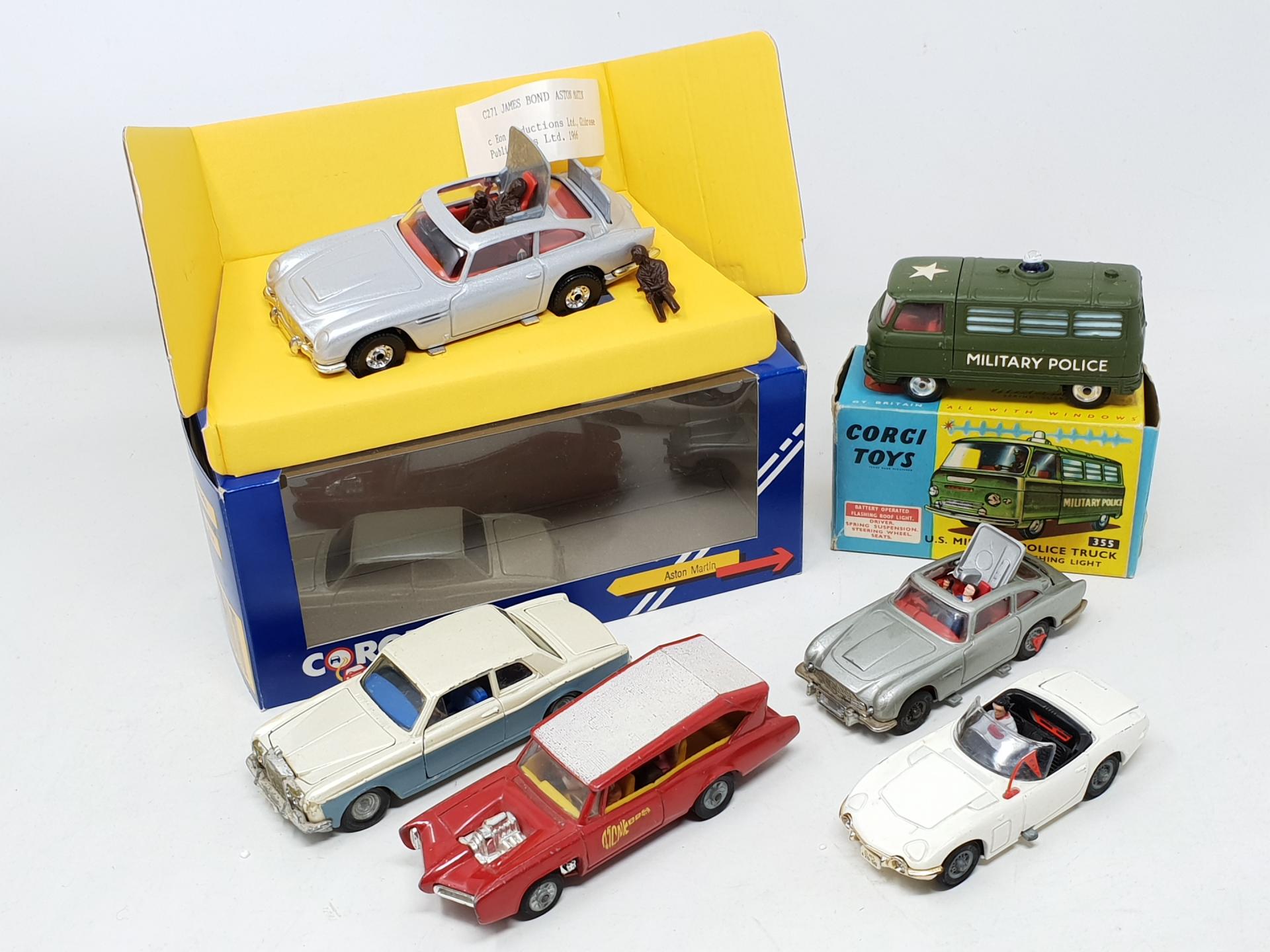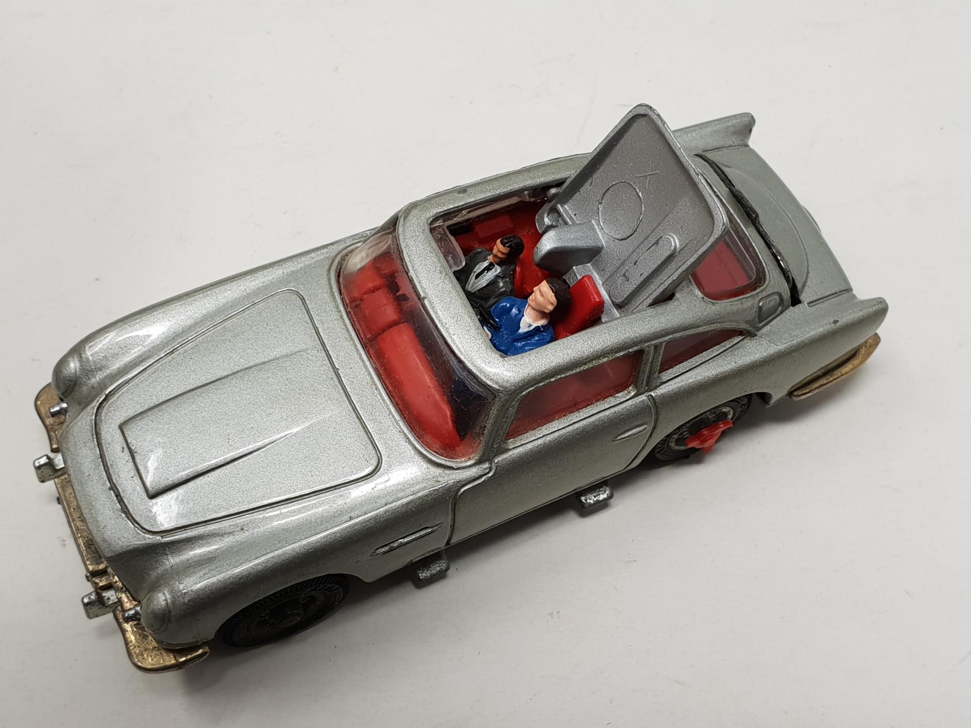 * CORGI TOYS, 6 modèles :réf 271 Aston-Martin DB5 James Bond 1/36ème (1986) complète de ses 2 méchants dont 1 de rechange A.b+réf 270 Aston-Martin DB5 James Bond 1/43ème (1972) roues à rayons avec papillons téléscopiques à l'arrière (la commande du toit ouvrant ne fonctionne pas) B+.o,réf 277 Monkeemobile C+.o,réf 336 Toyota James Bond (sans James et sans fusées) B.o,réf 273 Rolls Royce Silver Shadow "golden jacks" bicolore C+.o,réf 355 Commer military police B.c