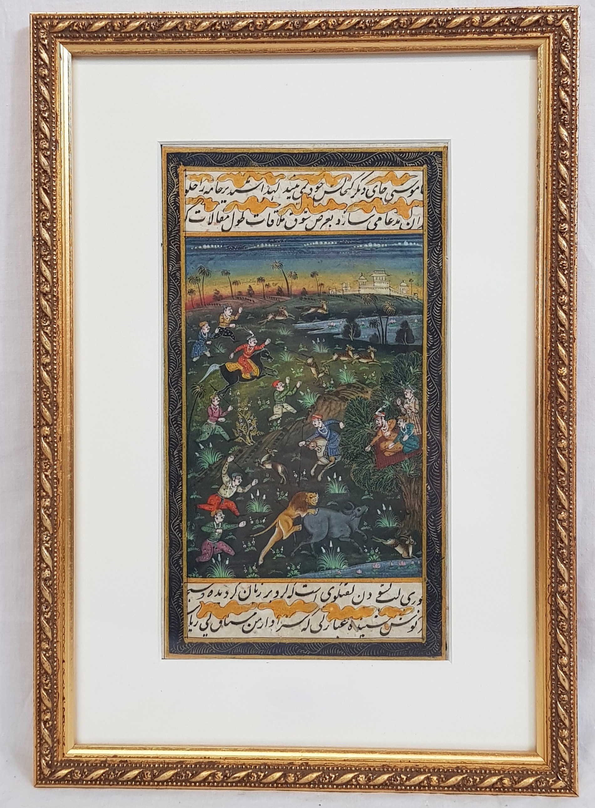 "Chasse aux lions" - enluminure persane - 21,5 x 12 cm - petits accidents