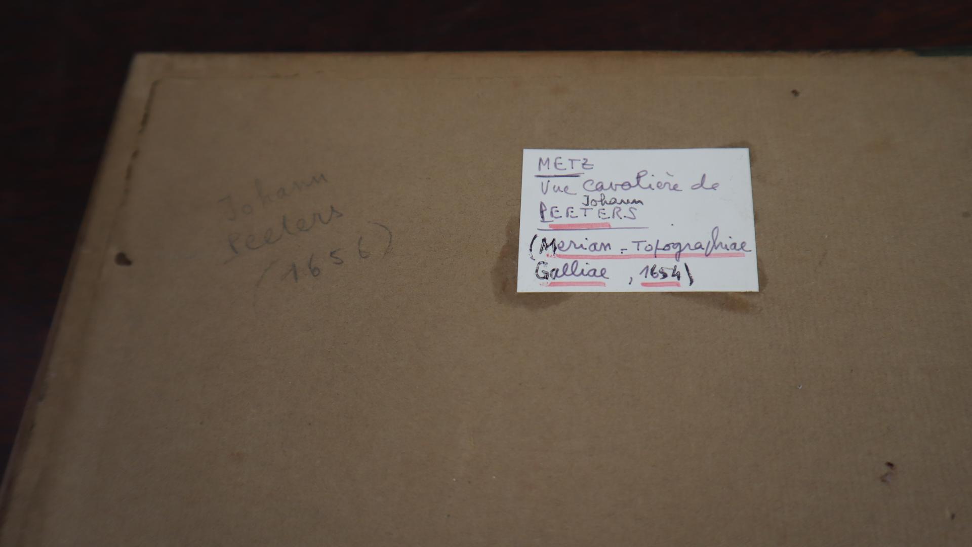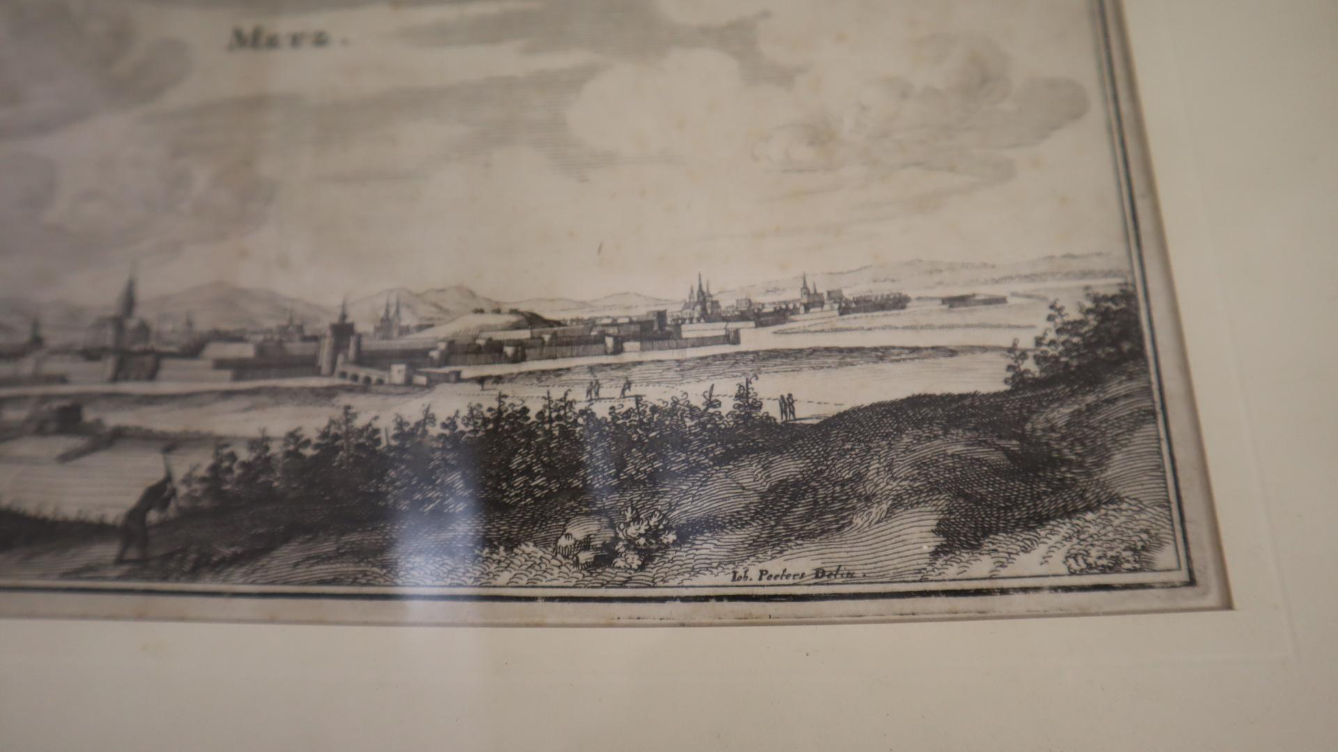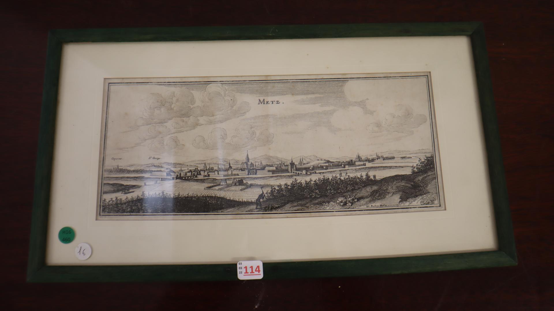 D'après Johannes PEETERS "Vue de la ville de Metz" - gravure en noir et blanc - époque XVIIeme -13,5x31,5 cm - sous verre cadre vert (rousseurs)