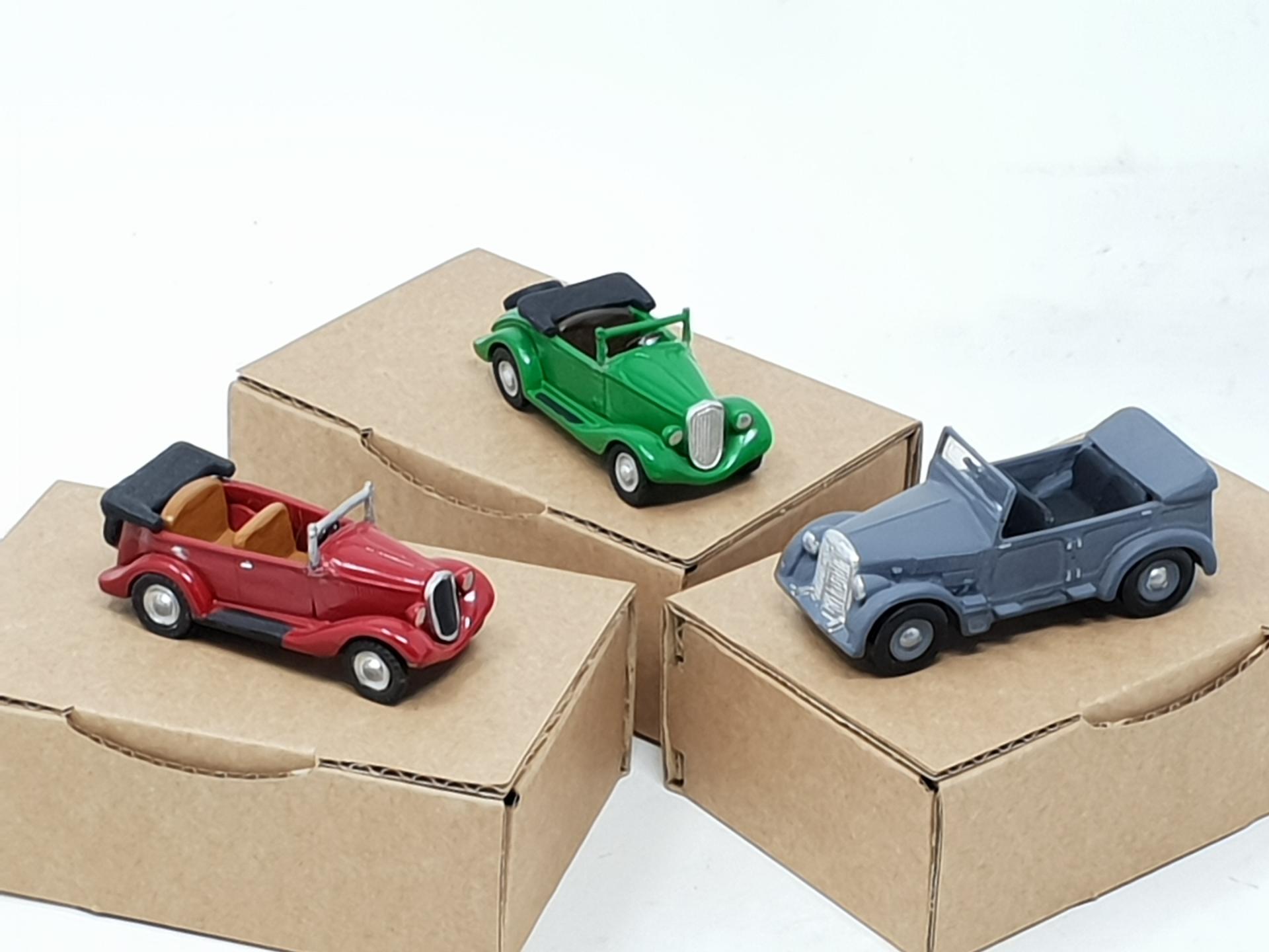 R-MODELLI (Paolo Rampini, 1975 white métal), 3 rare modèles :Fiat 508 torpedo 1934, Fiat 508s roadster, Fiat Campagnola militaire 1939-45 - on y joint 3 cartons de protection