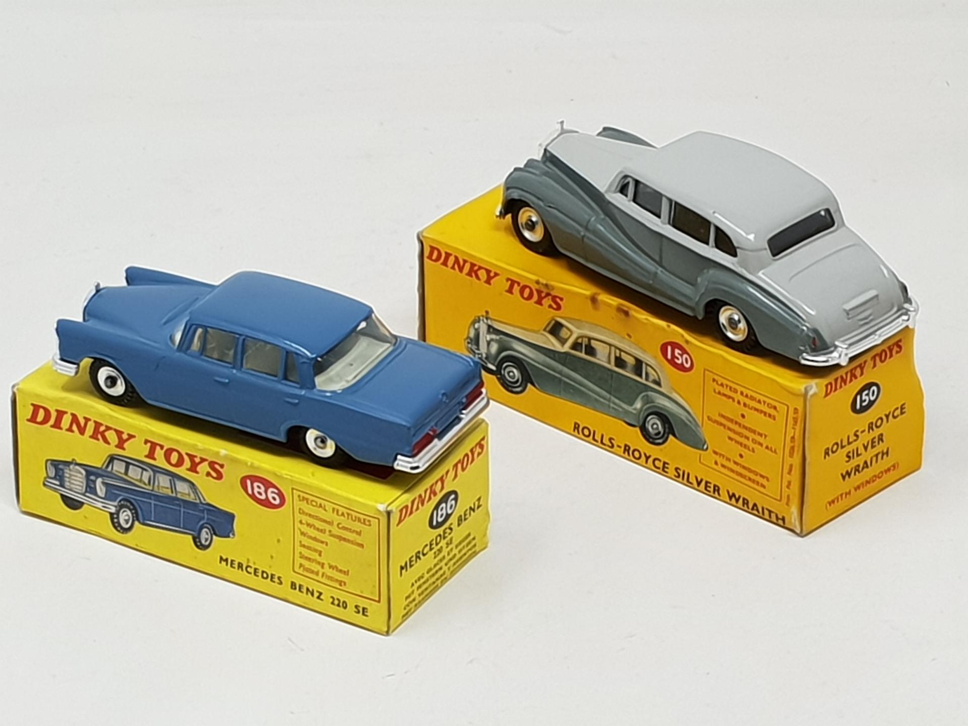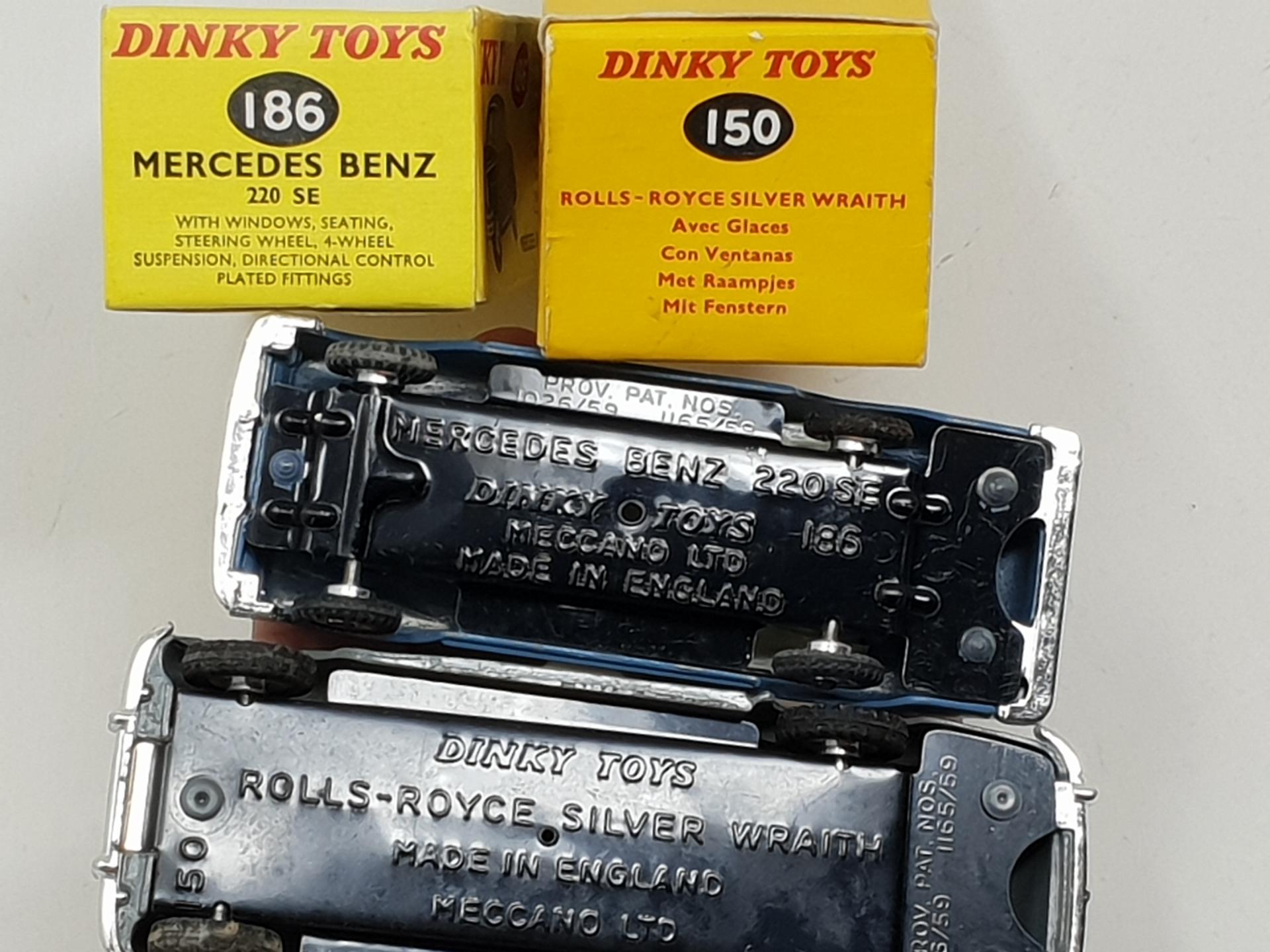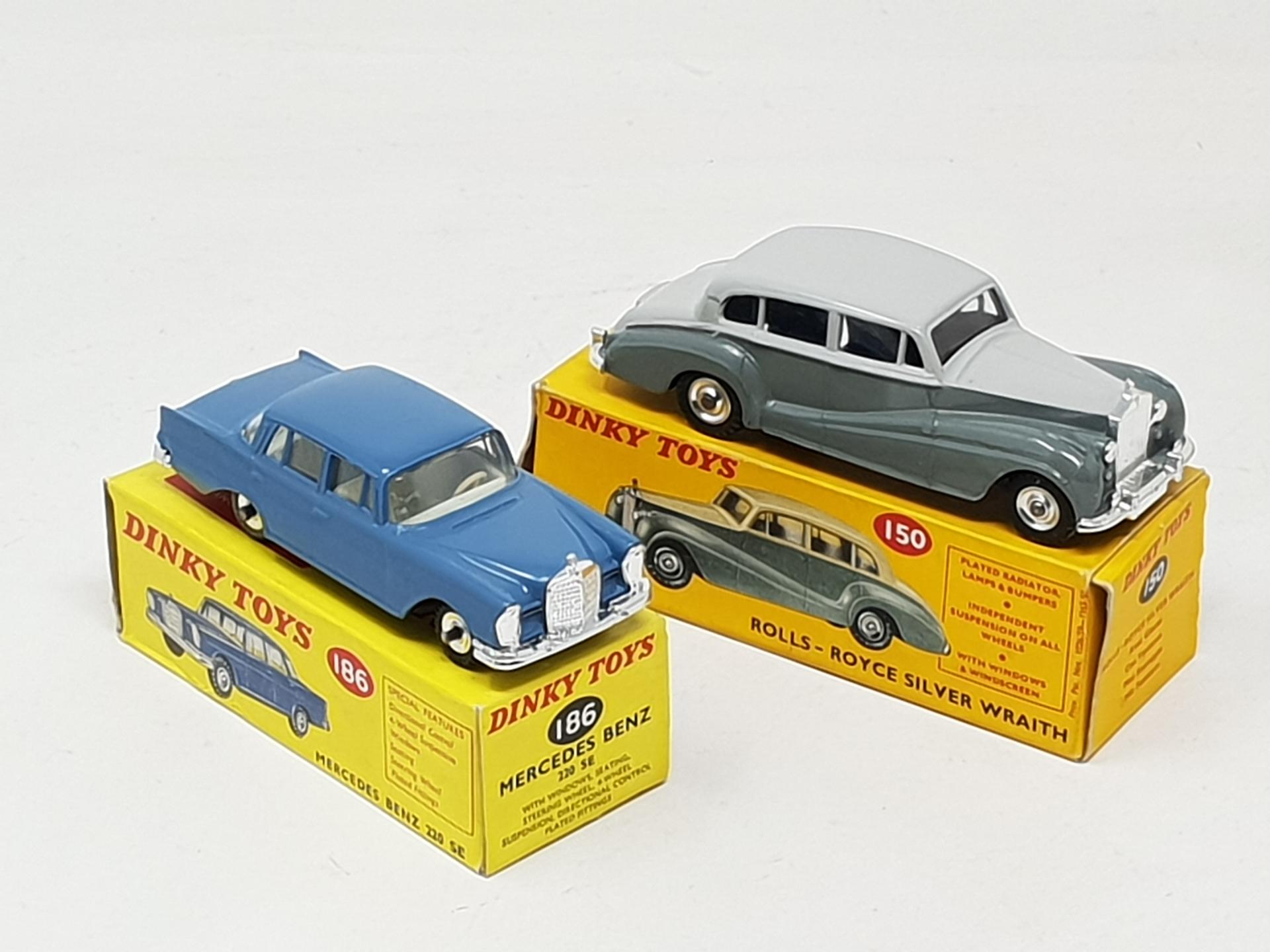 DINKY G.B., 2 modèles :réf 150 Rolls Royce Silver Wraith 2 tons de gris A.b,réf 186 Mercedes 220SE bleu RAF A.b