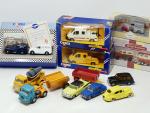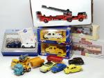 Lot comprenant :CORGI CLASSICS : Américan LaFrance aérial (boite abîmée),CORGI CLASSICS coffret de 2 véhicules Police "Dog section",CORGI CLASSICS coffret de 2 véhicules British Railways,CORGI : 2 dépanneuses Ford Transit,CORGI : Ford Popular camionnette Fullers,JOAL : 2 anciens camions usagés,CORGI TOYS : remorque basculante,SEEROL : Taxi Austin,NOREV : 3 anciens modèles plastique usagés.