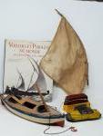 Lot comprenant :1 ancienne felouque en bois L : 37 cm, avec sa voile d'origine, mat à réparer,1 livre sur les pirogues et voiliers,1 autobus Dinky repeint, 1 voiture Joustra usagée