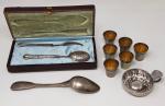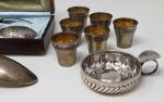 Un lot en argent - poinçon Minerve - composé de six gobelets à alcool - une cuillère de table - un taste vin - poids: 200.3g - on y joint un couvert de service manche argent fourré - divers états