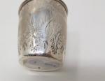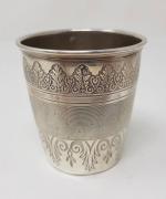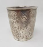 Une timbale en argent - poinçon Minerve - à décor de frise de feuilles d'acanthe - ciselée du prénom ODETTE - H: 6.5cm - poids: 57.3g - petits chocs et déformations