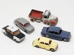 5 modèles usagés : NOREV Renault 4cv crème et Peugeot 403 gris, D.o, MERCURY Fiat Abarth 850 C.o, JRD Tracteur Unic seul D.o CIJ Simca 1000 Police C.o