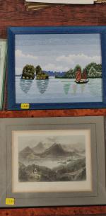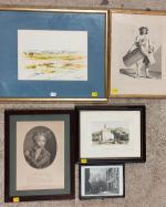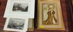 Un lot comprenant diverses reproductions, gravures et lithographies dont Le Provençal d'après Bouchardon, Agricola Viala, herbiers, vues de ville et une gravure religieuse d'après Abraham Ianssens (formats divers) - on y joint un lot de sous-verres, cadres photo et divers (rousseurs)