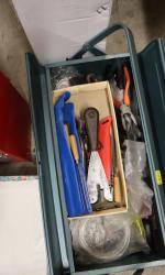 Une caisse à outils en métal laqué bleu et son contenu d'outillage manuel, un petit meuble en métal laqué rouge contenant visserie et fournitures diverses de bricolage, une travailleuse en tissu et son contenu de fournitures de mercerie, un écran de verdure vert