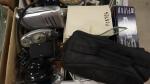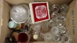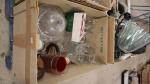 Deux cartons comprenant de la vaisselle dépareillée en verre et petits appareils électriques dont postes de radio, alarme BETALARM, lecteur de DVD portable TOSHIBA, petites fournitures diverses