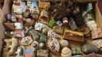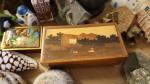 Un lot de diverses miniatures de maisons du monde entier en bois, plâtre, tapis, résine et une petite boîte en marqueterie,